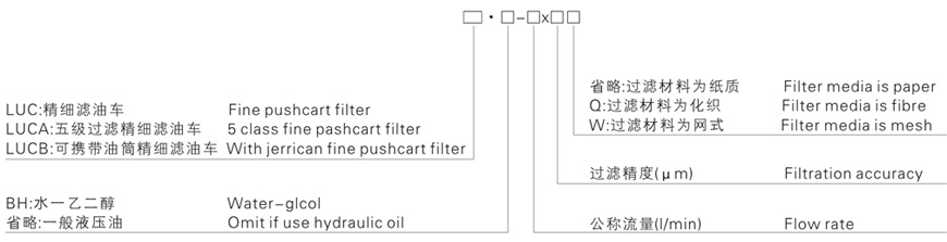 (1)*为过滤精度。若使用介质为水一乙二醇时,公称流量63L/min,过滤精度5μm,过滤材质为纸质时,滤油车的型号为LUC·BH-63x5或 LUCA·BH-63X5,精滤器滤芯的型号为CZX·BH-63X5或 CZXA·BH-63X5。