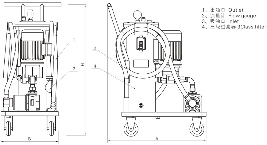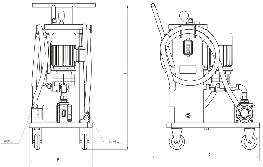 (2)为了确保滤油车额定沉量,并能正常使用权,用户自配油管的内径应符合上表规格;并注意,在工作中吸油管不得有压扁现象,以免油泵损坏,吸油度高度差<500mm。吸油软管不得加长;回油软管不得长于8m。